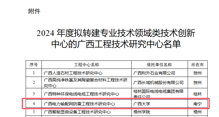 近日,广西壮族自治区发布了2024年度拟转建专业技术领域类技术创新中心的广西工程技术研究中心名单,广西电力输配网防雷工程技术研究中心入选,已经成功转建为广西电力输配网防雷工程技术创新中心,后续因研究方向拓展,将更名为广西电力装备及系统安全技术创新中心(以下简称“中心”)。该中心以产业前沿引领技术和关键共性技术研发与应用为核心,加强应用基础研究,协同推进现代工程技术和颠覆性技术创新,打造创新资源集聚、组织运行开放、治理结构多元化的综合性产业技术平台。中心主要研究广西复杂气候环境下电力装备及绝缘材料安全、数字化防爆电力装备及系统运行安全、电力装备的在线监测和雷电防护等方向,由广西壮族自治区优秀专家、36365线路官网教授张镱议担任负责人。