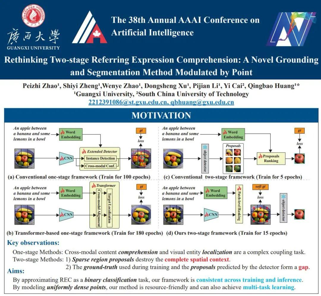 36365线路官网控制工程专业人工智能方向2021级硕士生赵沛芝同学张贴了其论文《Rethinking Two-Stage Referring Expression Comprehension: A Novel Grounding and Segmentation Method Modulated by Point》的海报。论文针对了REC,RES任务中的一阶段、二阶段方法进行了回顾总结,提出了一种先回归中心,后回归定位、分割的方法,极大地减少了可训练参数,并且能够更快地收敛,在REC和RES榜单中占据领先。值得一提的是,这篇工作是AAAI2024中唯一一篇关于图像REC的工作。赵沛芝同学分享了论文,回答了与会师生提出的问题,并与相关学者进行了深入交流。